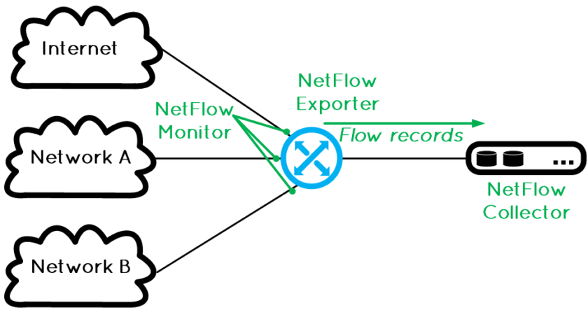 - Netflow Records : وظیفه مشخص کردن Key, nonkey Fields را جهت مانیتور و گرفتن خروجی به عهده دارد. زمانی که در جریان ترافیک با این کلیدها مطالبقت پیدا شود اطلاعات مربوط به آن جریان ترافیک به عنوان یک Netflow record در Cache ذخیره می گردد و در ادامه اطلاعات جدید بدست آمده مربوط به این جریان ترافیک به این رکورد اضافه می گردد (مانند حجم بسته ارسالی).