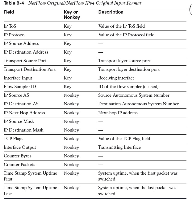 در Netflow این کلیدها ثابت هستند و هیچ گونه تغییری در آنها نمی تواند ایجاد کرد. Flexible Netflow این امکان را برای ما فراهم می کند که کاربر براساس نیاز خود این کلیدها را تنظیم کند. در Netflow با توجه به اینکه کلید ها ثابت هستند و امکان تغییر آنها وجود ندارد حجم داده ارسالی شامل تمام کلیدها می باشد و بسیاری از آنها شاید مورد نیاز نباشد ولی با Flexible Netflow می توان مشخص کرد که چه فیلد هایی مورد نیاز است و از فیلد های غیر ضروری صرفه نظر کرد و باعث کاهش حجم داده ارسال شد. در جدول زیر فیلدهای ورودی مربوط به Netflow نمایش داده شده است.